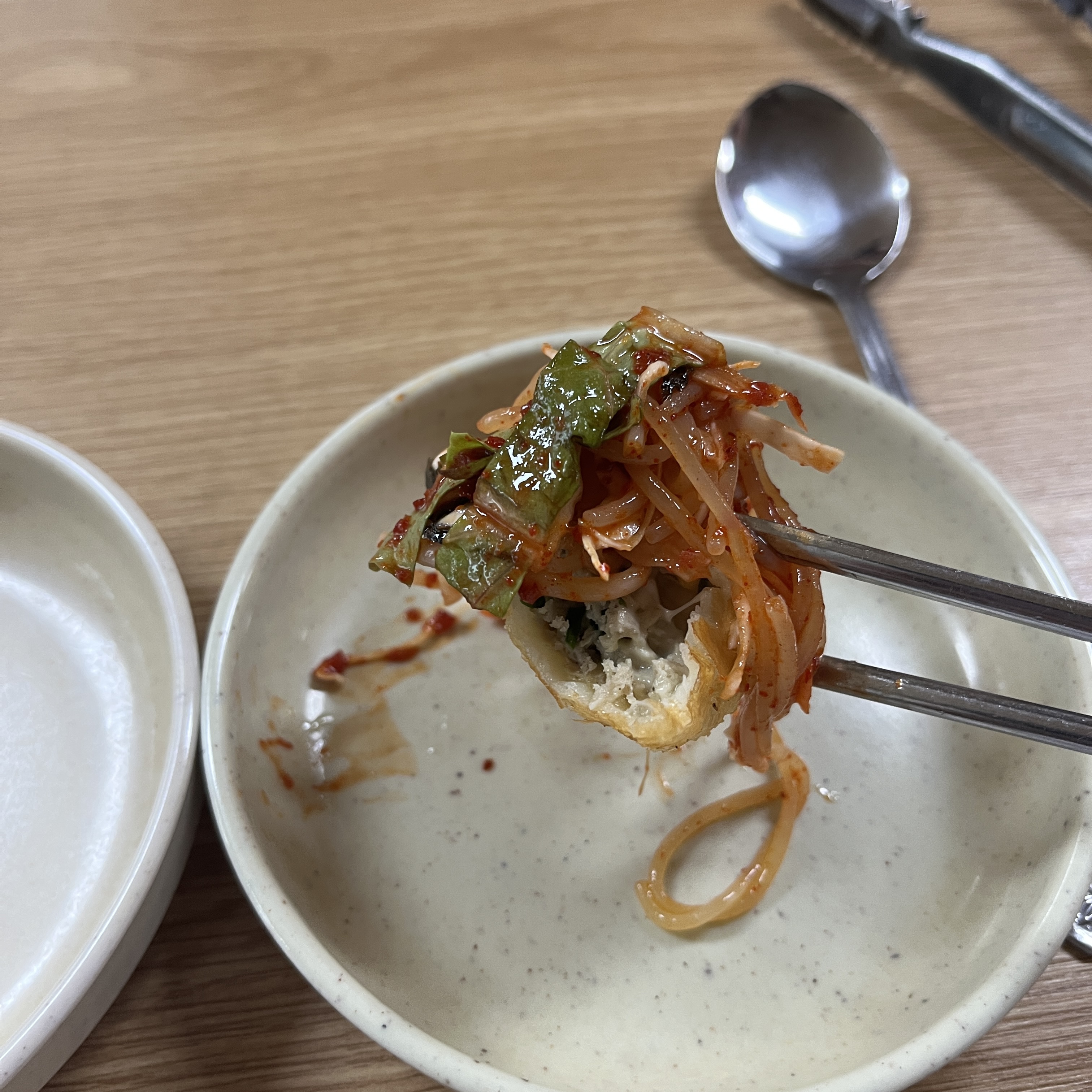 그리고 만두만큼 특별한게 저 김친데요, 볶음김치와 생김치 사이의 어느 맛인데, 저것도 계쏙 떙기는 맛이에요.