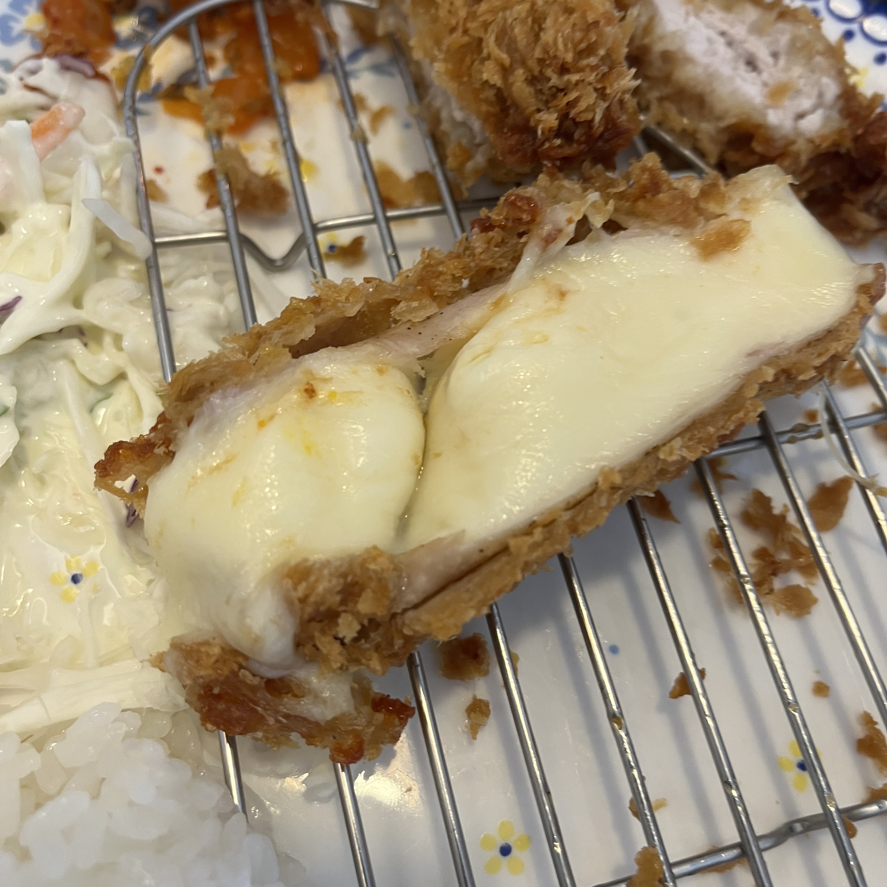 거기에 바삭한 튀김옷과, 돼지고기가 만나니. 아주 만족스러운 치즈돈까스 조각이 되었습니다.