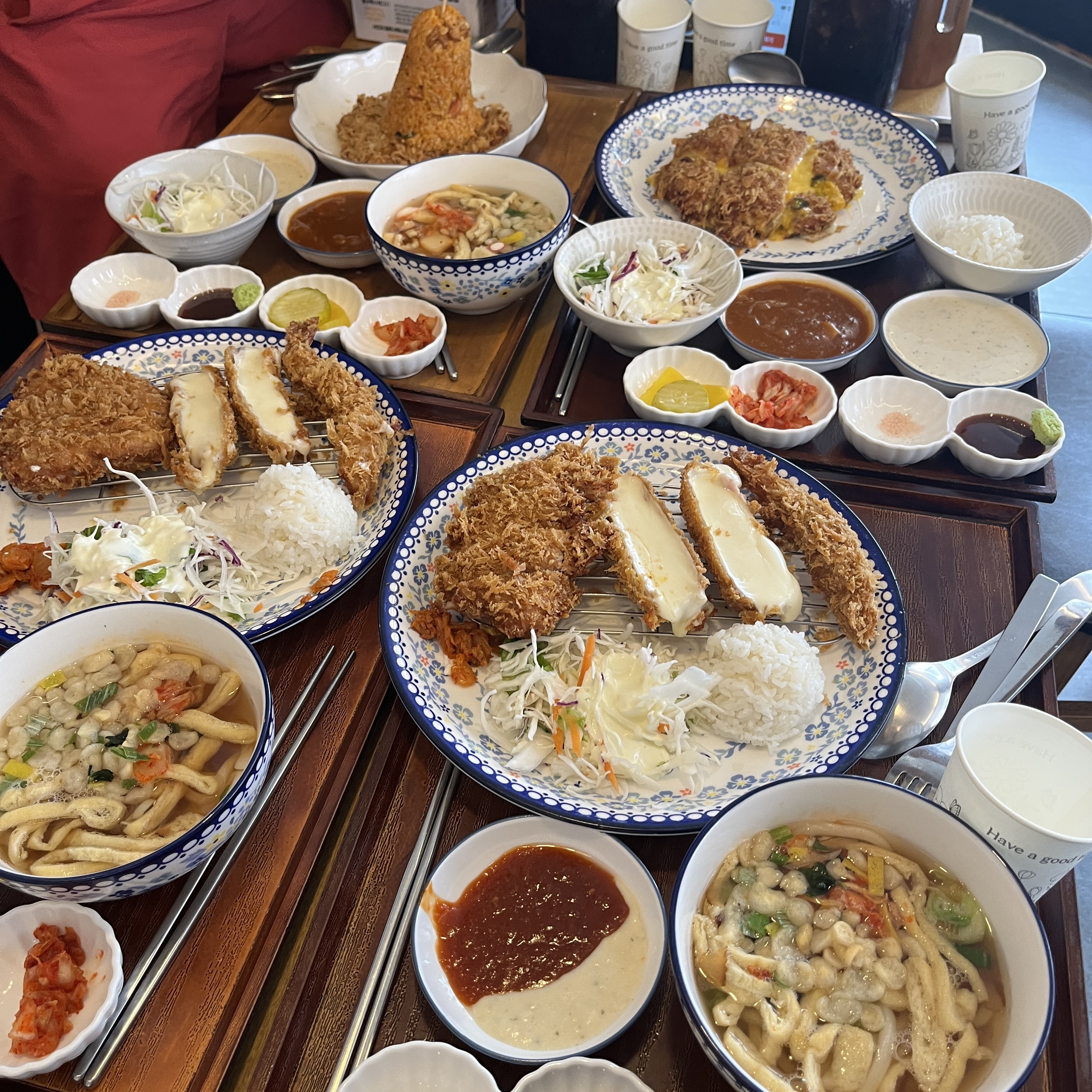 우동이 함께 나오는 등심/치즈/새우까스 2세트에, 김치볶음밥과 함께 나오는 김볶돈 1세트, 그리고 단호박치즈돈까스에 음료수 2개까지.